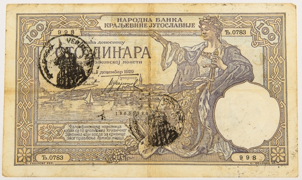 • Numismática, Iugoslávia. 100 Dinars 1929. Com carimbo de ocupação `Verificato` validando sua circulação.