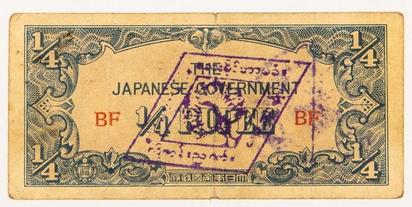 • Numismática, Japão. II Guerra Ocupação Myanmar. 1/4 Rúpia com carimbos de resgate.
