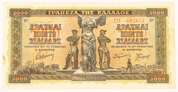 • Numismática, Grécia. II Guerra 5000 Dracmas 1942.