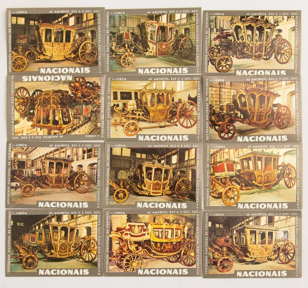 • Colecionismo - 12 Figurinhas da caixa de fosforos (Match Covers) - Fosforos Nacionais - Soc. Nacional de Fosforos - Lisboa - Portugal - Motivo: Carruagens do Museu Nacional de Coches