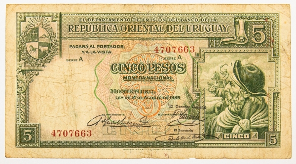• Numismática, Uruguai. 5 Pesos, P. 29 b, MBC.