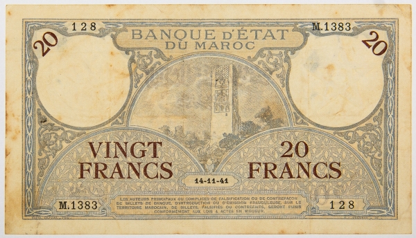 • Numismática, Marrocos. 20 Francos, P. 18 b, MBC.