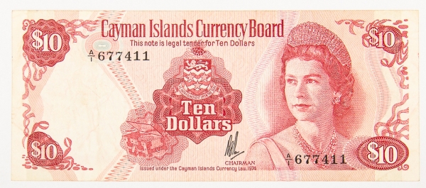 • Numismática, Cayman. 10 dólares, P. 7, MBC.