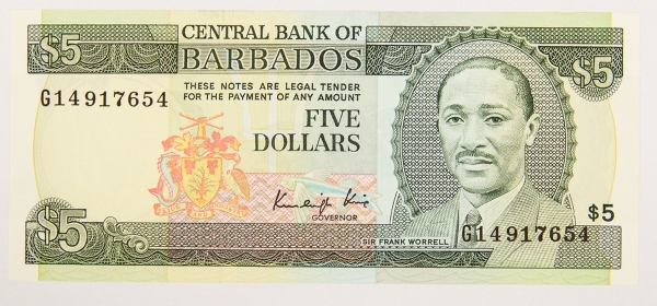 • Numismática, Barbados. 5 dólares, P. 37, Fe.