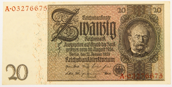 • Numismática, Alemanha. Cédula de 20 Marcos 1929 P-181a