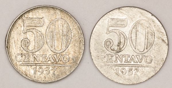 • Numismática, Brasil. 50 centavos 1957. Disco grosso e disco fino.