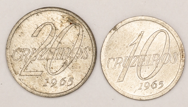 • Numismática, Brasil. 10 e 20 cruzeiros. 1965. Brilho de cunho.