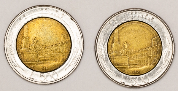 • Numismática, Itália. 500 liras 1982 - 1984. Flor de Cunho.