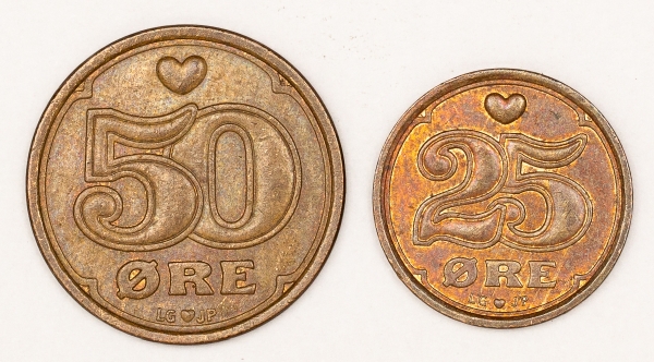 • Numismática, Dinamarca. 25 e 50 ore 1991, 1990.