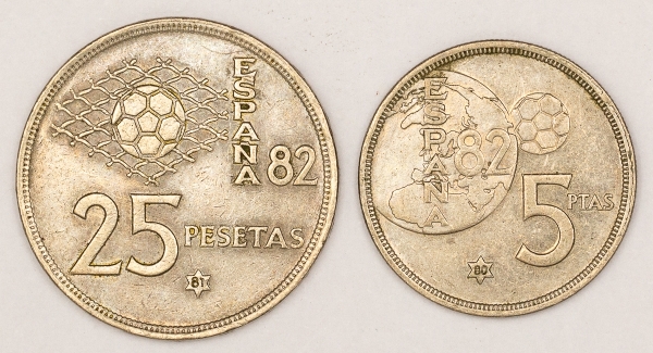 • Numismática, Espanha. 5 e 25 pesetas 1982. Copa do mundo.