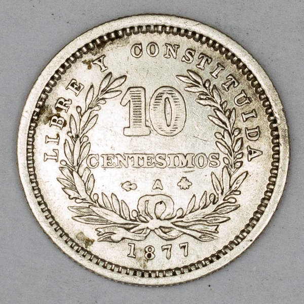 • Numismática, Uruguai. Moeda de 10 centésimos, 1877, Prata 900, data raríssima, KMH 14.