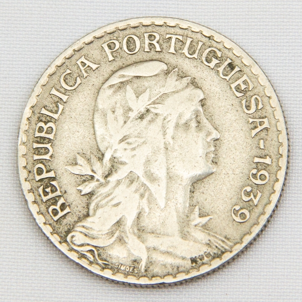 • Numismática, Portugal. Moeda de 1 escudo, ano 1939, Alpaca, 26.8mm, 2a data mais rara da série, KMH 578.