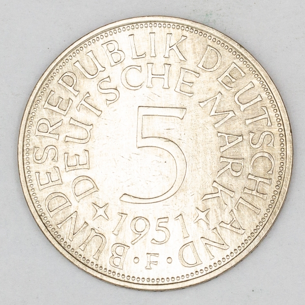 • Numismática, Alemanha. Moeda de 5 marcos, 1951 F, Prata, escassa, KMH 1/2-1.