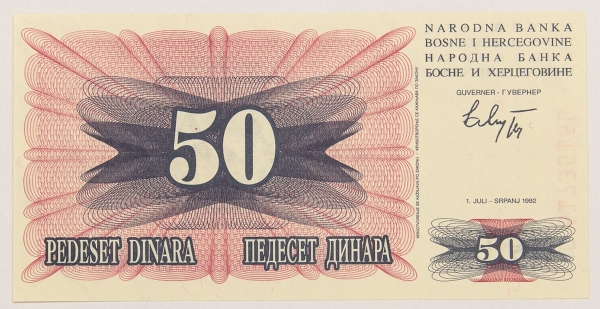 • Numismática, BOSNIA HERZEGOVINIA. Uma Cédula P-12 50 Dinars 1992 Flor de Estampa