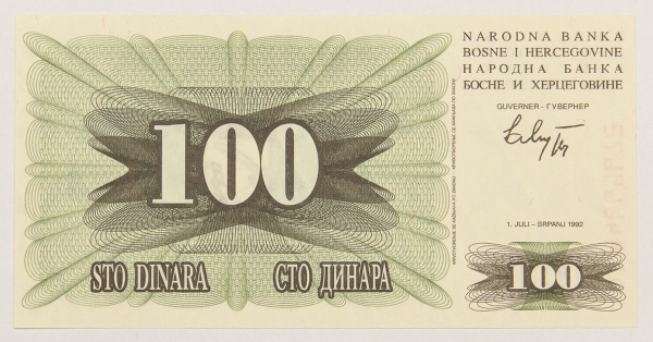 • Numismática, BOSNIA HERZEGOVINIA. Uma Cédula P-13 100 Dinars 1992 Flor de Estampa