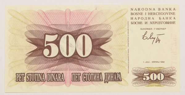 • Numismática, BOSNIA HERZEGOVINIA. Uma Cédula P-14 500 Dinars 1992 Flor de Estampa