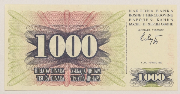 • Numismática, BOSNIA HERZEGOVINIA. Uma Cédula P-15 1000 Dinars 1992 Flor de Estampa