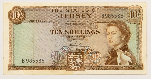 • Numismática, JERSEY. Uma Cédula P-7 10 Shillings 1963 QEII