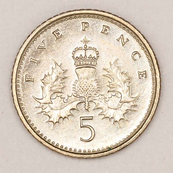 • Numismática, Reino Unido. 5 pence 1996. Flor de cunho.