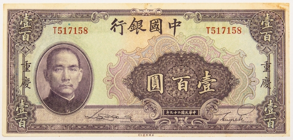 • Numismática, CHINA. Uma Cédula P-88 100 Yuan 1940