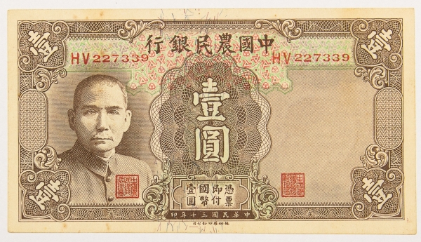 • Numismática, CHINA. Uma Cédula 1 Yuan Farmers Bank