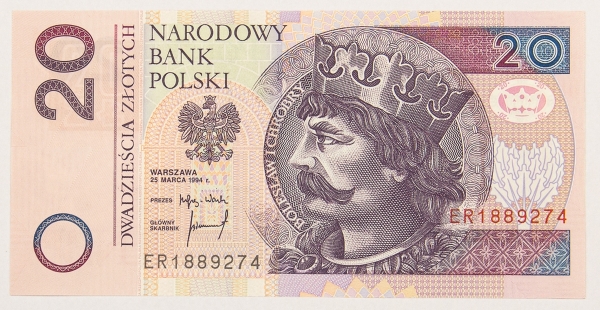 • Numismática, POLONIA. Uma Cédula P-174 20 Zlotych 1994 Flor de Estampa