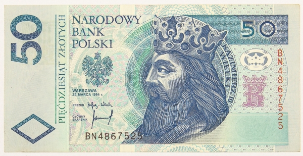 • Numismática, POLONIA. Uma Cédula P-175 50 Zlotych 1994 Flor de Estampa