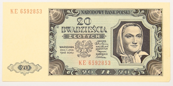 • Numismática, POLONIA. Uma Cédula 20 Zlotych 1948 Flor de Estampa