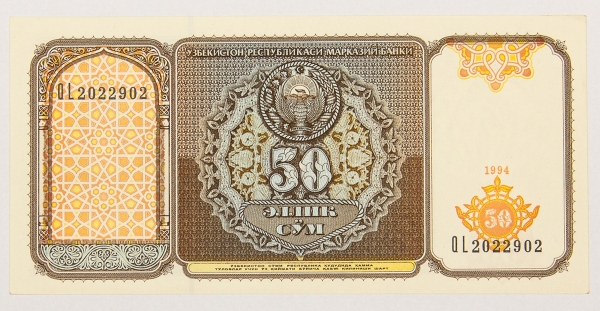 • Numismática, UZBEKISTAN. Uma Cédula 50 Cym 1994 Flor de Estampa