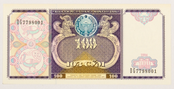 • Numismática, UZBEKISTAN. Uma Cédula 100 Cym 1994 Flor de Estampa