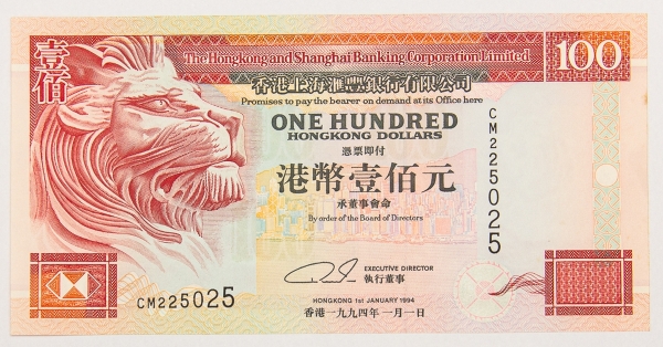 • Numismática, HONG KONG. Uma Cédula P-203 100 Dollars 1994