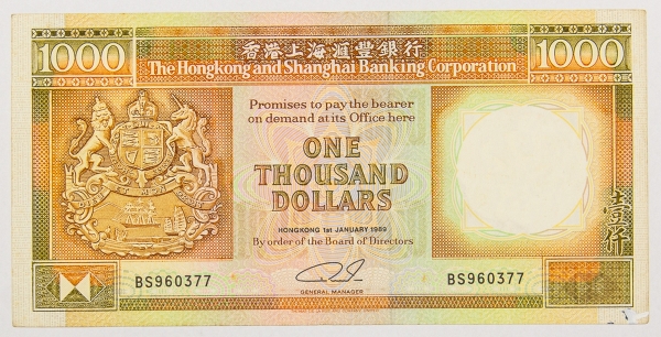 • Numismática, HONG KONG. Uma Cédula P-199 1000 Dollars 1989