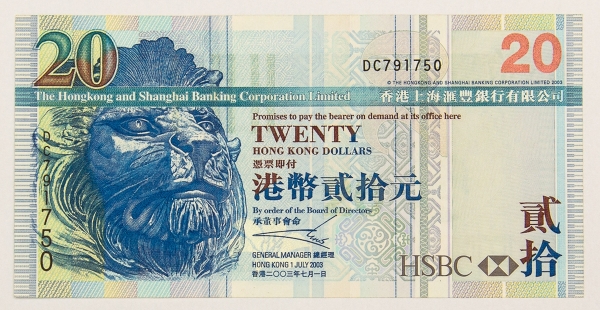 • Numismática, HONG KONG. Uma Cédula P-207 20 Dollars 2003 Flor de Estampa
