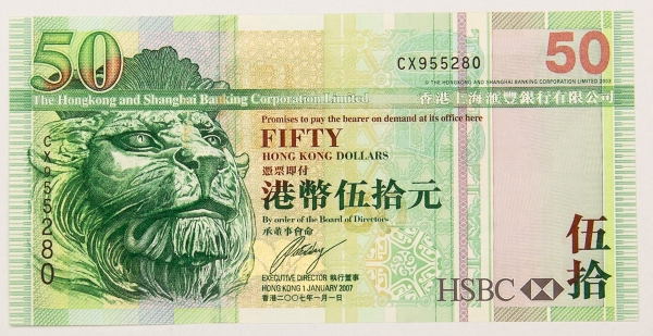 • Numismática, HONG KONG. Uma Cédula P-208 50 Dollars 2007 Flor de Estampa