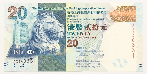 • Numismática, HONG KONG. Uma Cédula P-212 20 Dollars 2010 Flor de Estampa