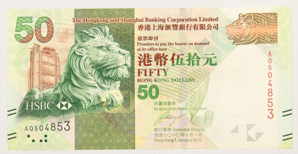 • Numismática, HONG KONG. Uma Cédula P-213 50 Dollars 2010 Flor de Estampa