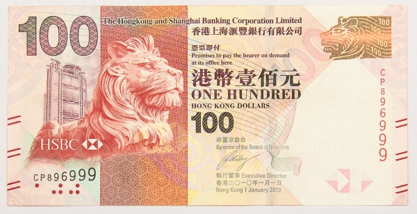 • Numismática, HONG KONG. Uma Cédula P-214 100 Dollars 2010 Flor de Estampa