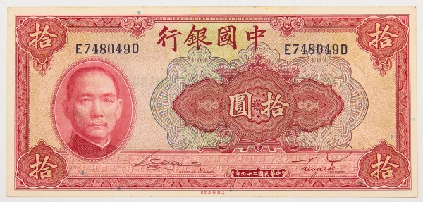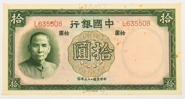 • Numismática, CHINA. Uma Cédula P-79 10 Yuan 1937