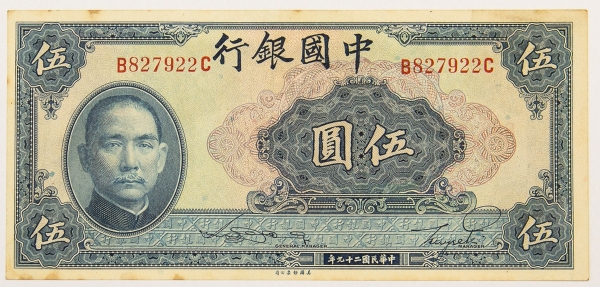 • Numismática, CHINA. Uma Cédula P-84 5 Yuan 1940