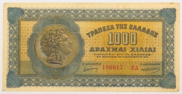 • Numismática, Grécia. 1000 Dracmas 1941.