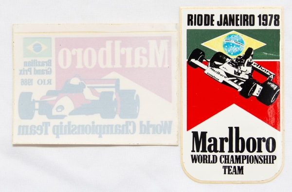• Lote com 02 adesivos do GP Brasil 1986 e 1987 da Marlboro.