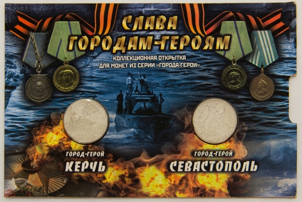 • Numismática, Rússia. Cartela com 5 peças 2015. Encarteladas. II Guerra.