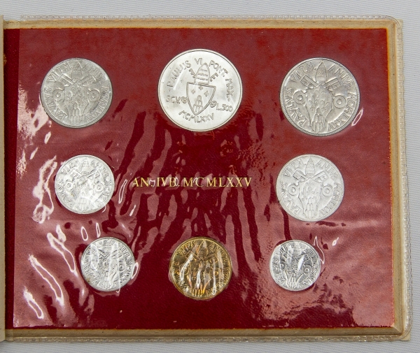 • Numismática, Vaticano. Cartela com 8 moedas incluindo 500 Liras em Prata. Cartela oficial com crescente valorização. Oportunidade. Ano MCMLXXV 1975.