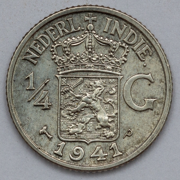 • Numismática, Índias Holandesas. 1/4 G. Prata 1942. Lindo exemplar.