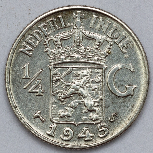 • Numismática, Índias Holandesas. 1/4 G. Prata 1945. Linda.