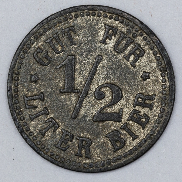 • Numismática. Magnífica peça. Proveniente de importante coleção adquirida na Alemanha. Notgeld. Ficha Alemã para 1/2 litro de cerveja.