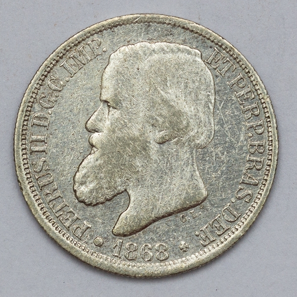 • Numismática, Brasil. 200 Réis 1868. Prata 3º sistema. Cabecinha.
