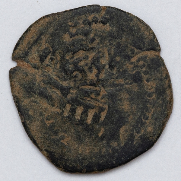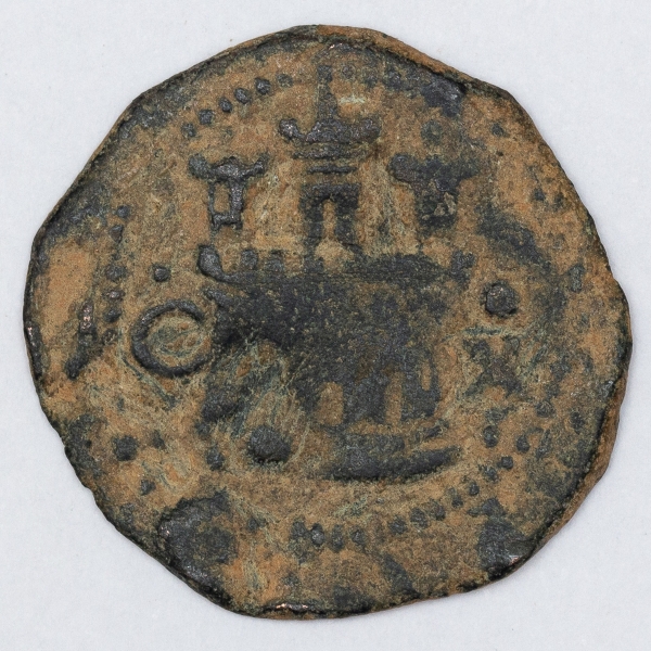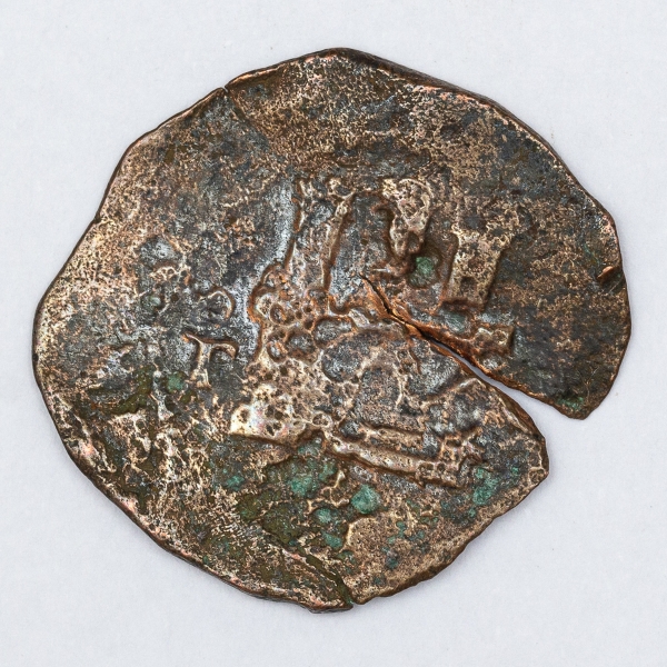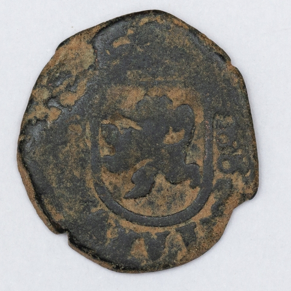 • Numismática, Espanha. Região da Galícia. Proveniente de achado arqueológico. Preserva resquícios do solo onde foi encontrada. Acreditamos Felipe IV. 1621-1655. Também conhecida como moeda ou dinheiro de pirata. Muito atraente para estudo e catalogação.
