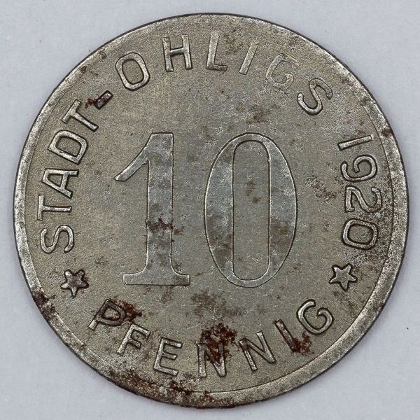 • Numismática. Magnífica peça. Proveniente de importante coleção adquirida na Alemanha. Notgeld. 10 Pfennig 1920 Ohligs. Linda.