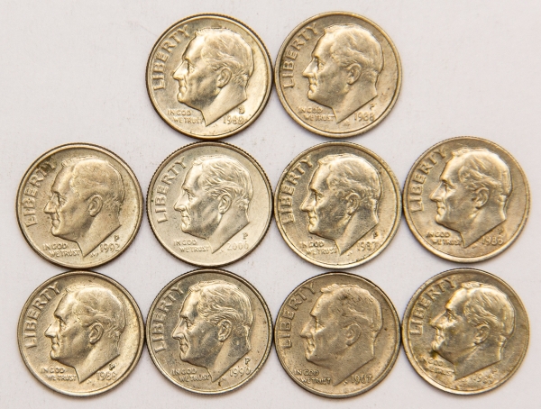 • Numismática, E.U.A. Lote com 10 Moedas One Dime.